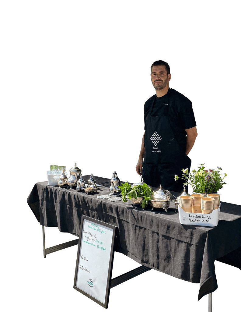 Finde uns auf Märkten in Hamburg oder buche uns für private Events mit frischem marokkanischem Minztee und süßen Spezialitäten.